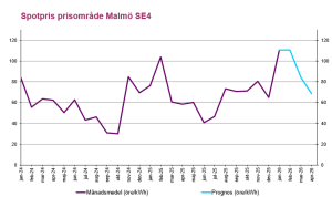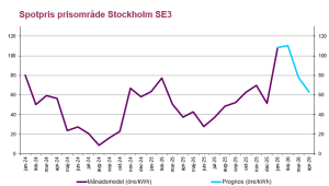 Spotpriset bedöms ligga kvar på en relativt hög nivå en tid framöver, men marknadsläget har stabiliserats. Det märks genom att priserna på de närmaste vecko- och månadskontrakten har fallit.