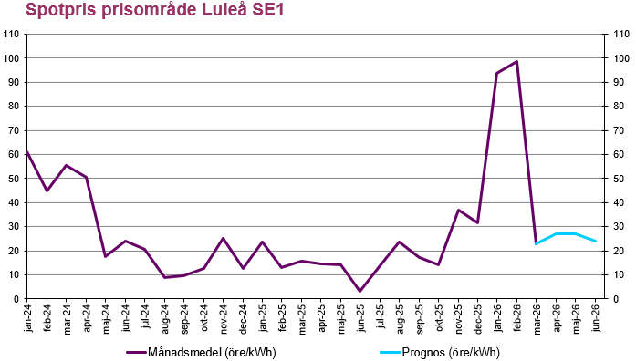 Sammantaget väntas en sidledes prisutveckling i norra Sverige under maj, medan priserna i södra Sverige bedöms bli något lägre, främst till följd av minskad elförbrukning.
