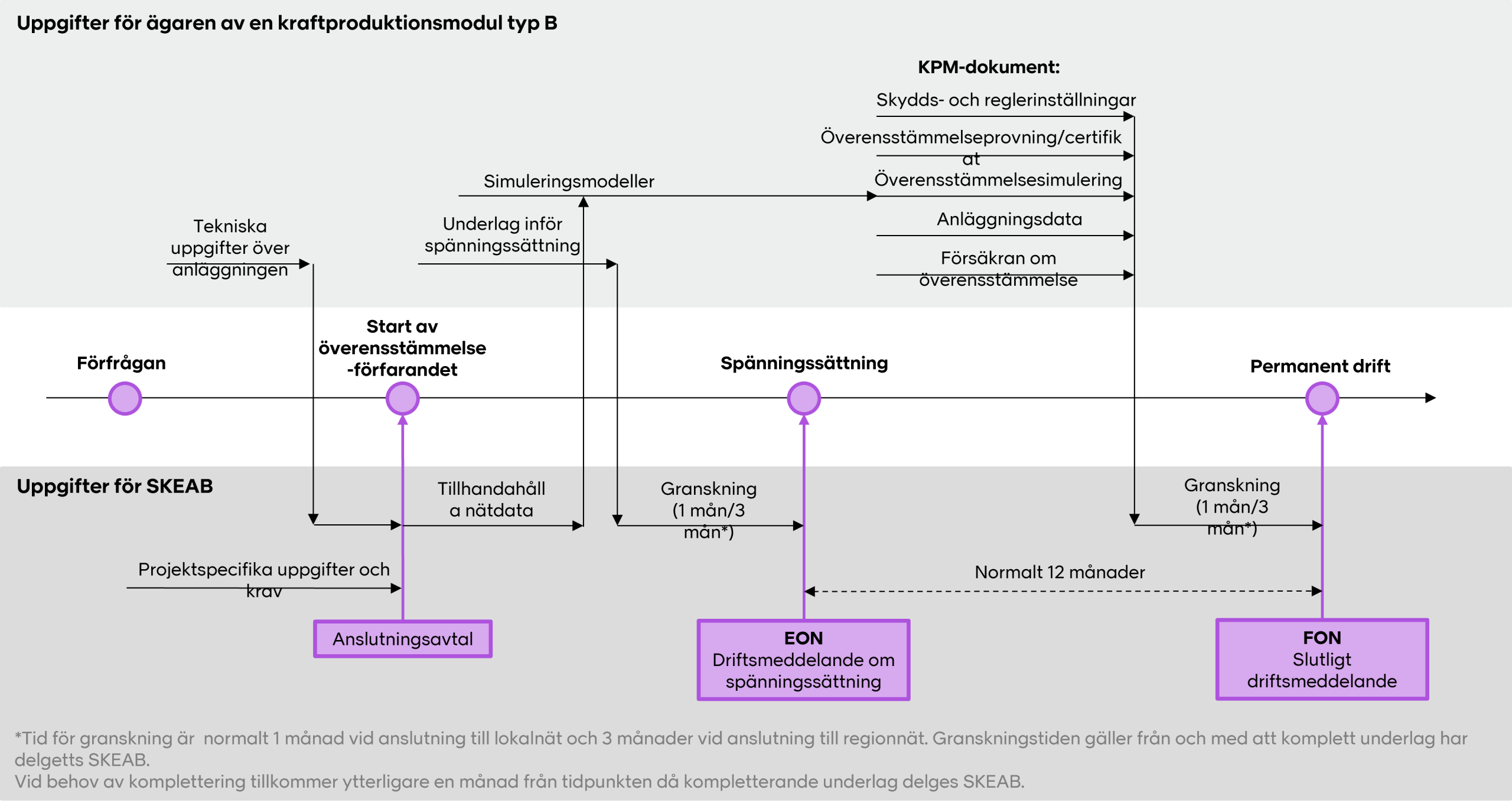Processerna illustreras mer i detalj under rubrikerna Förfarande för driftsmeddelanden typklass B respektive Förfarande för driftsmeddelanden typklass C och D nedan. Detaljer kring vilka underlag som ska lämnas in i samband med förfrågan och anslutningsavtal samt inför de olika driftsmeddelandena finns beskrivet separat för respektive typ under rubrikerna Underlag kraftparksmodul respektive Underlag synkron kraftproduktionsmodul. Ytterligare information finns också i anslutningsguiderna. Utöver det som krävs enligt RfG, kan även andra krav och rutiner gälla för anslutningen.